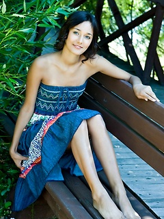 Fina shows her hairy pussy on the blue park bench